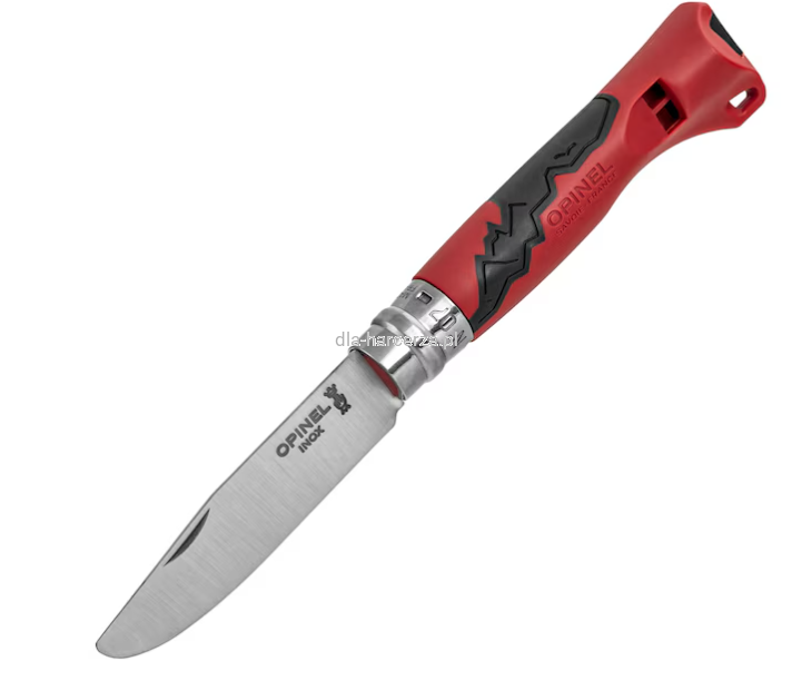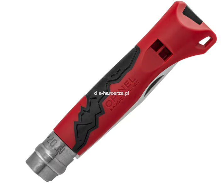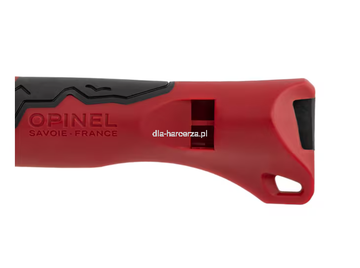Ergonomicznie wyprofilowana rękojeść wykonana została z wytrzymałego tworzywa sztucznego i gumy, zapewnia pewny chwyt i bezpieczeństwo użytkowania. Dodatkowo wbudowano w nią otwór umożliwiający przewleczenie linki oraz gwizdek o mocy 110 dB, który działa niezależnie od warunków pogodowych, słyszalny z odległości do 300 m.